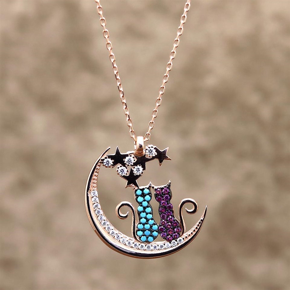 925 Ayar Gümüş Ay Üstünde Oturan Aşık Kediler Hayalet Kolye |