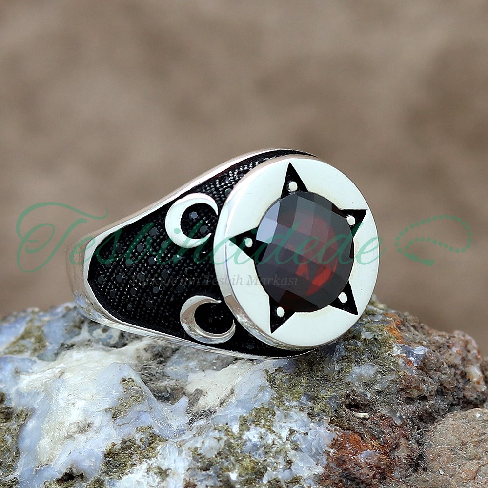 | Ürün Adı | 925 Ayar Gümüş Ay Yıldız Tasarım Kırmızı Zirkon Taşlı Erkek Yüzük |