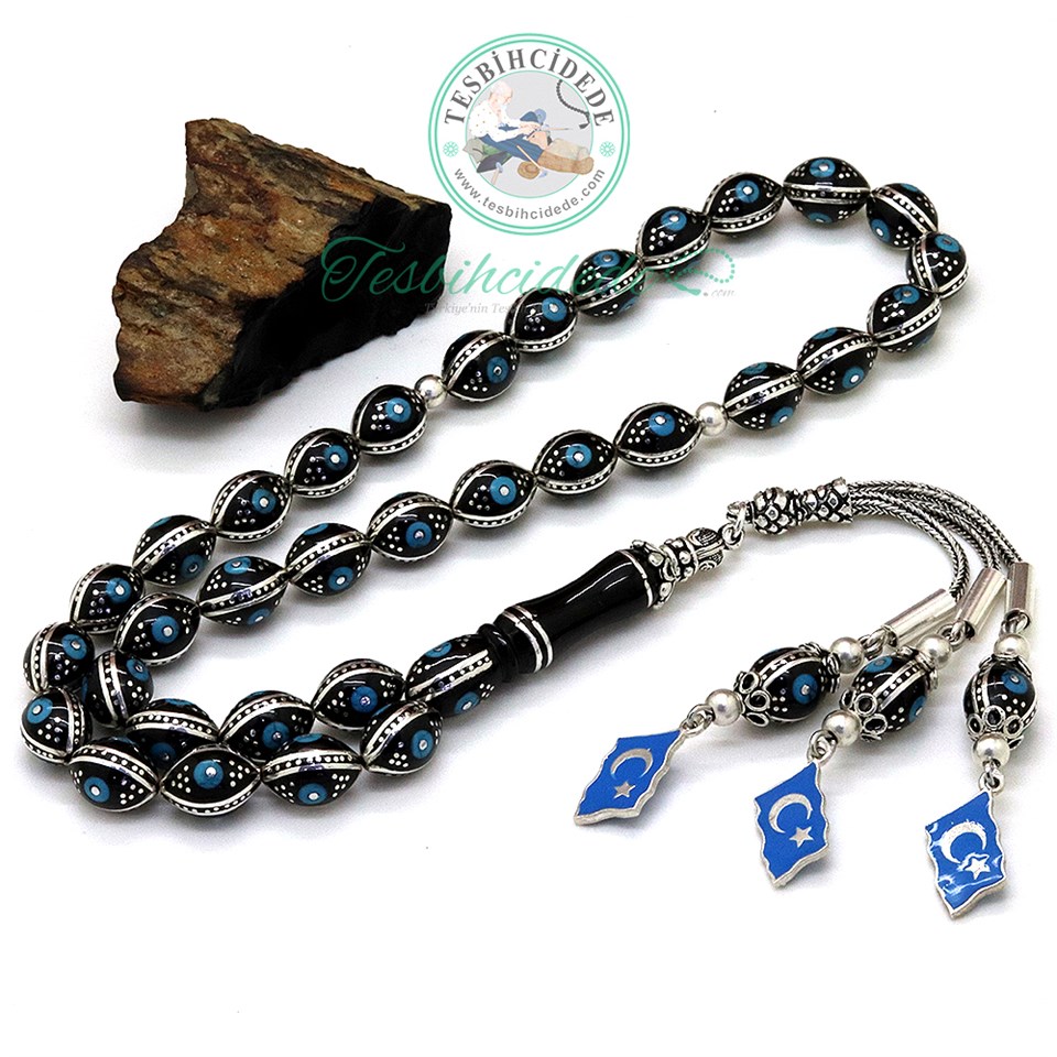 | Ürün Adı | 925 Ayar Gümüş Ayyıldız Özel Tasarım Firuze ve Karpuz İşlemeli Erzurum Oltu Taşı Tesbih |