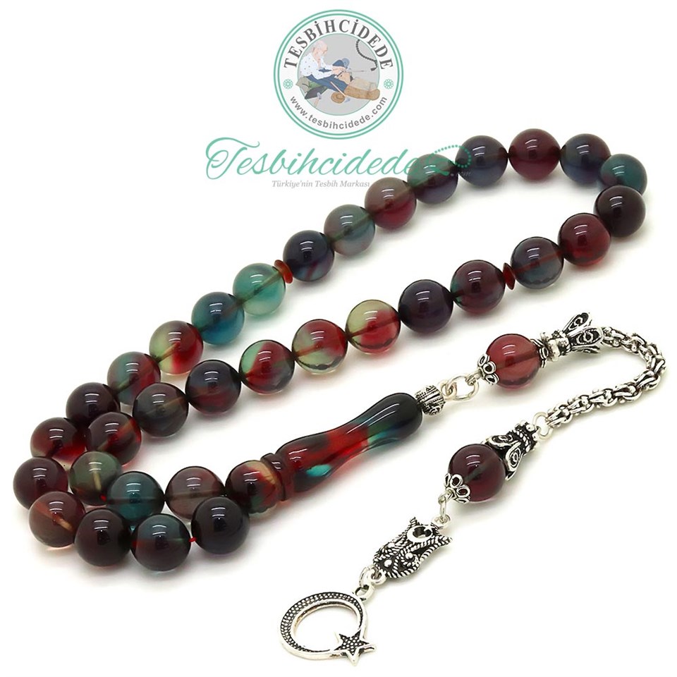 925 Ayar Gümüş Ayyıldız Püsküllü Rengarenk Sıkma Kehribar Tesbih |