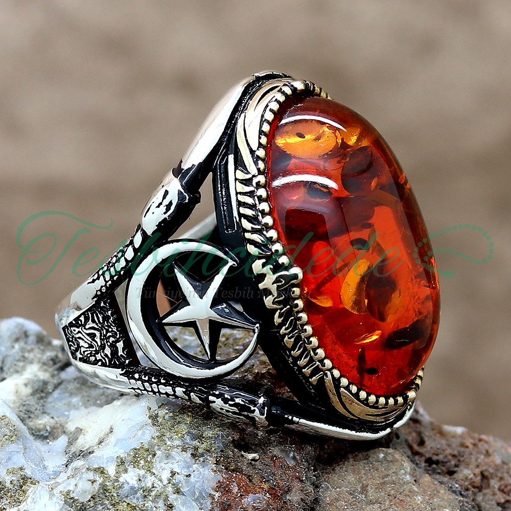 925 Ayar Gümüş Ayyıldız Sıkma Kehribar Taşlı Erkek Yüzük |