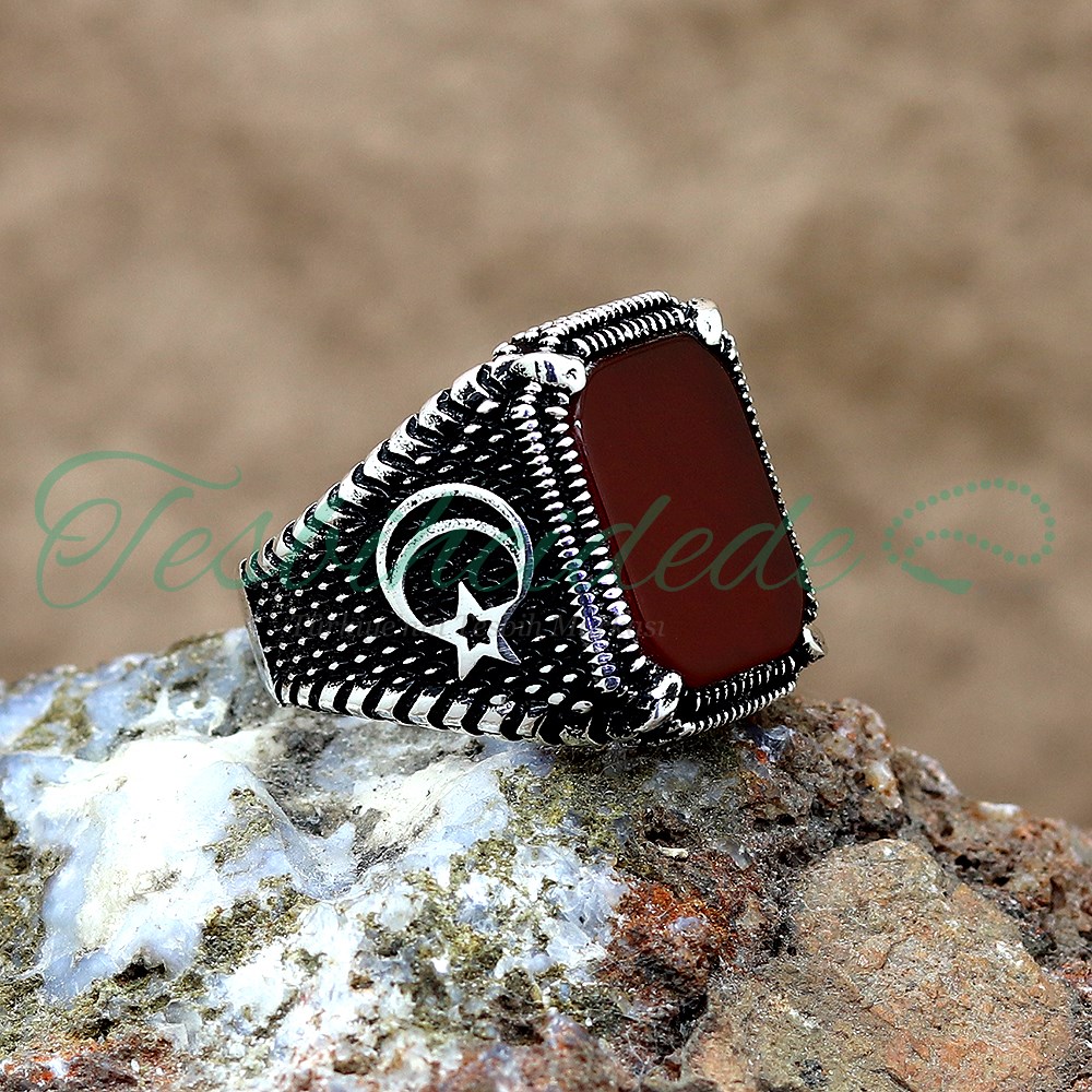 925 Ayar Gümüş Ayyıldız Tasarım Akik Taşlı Erkek Yüzük |