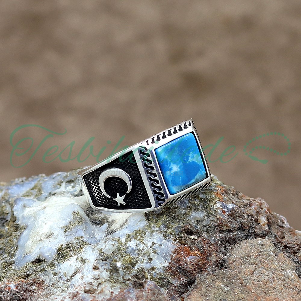 925 Ayar Gümüş Ayyıldız Tasarım Firuze(Turkuaz) Taşlı Erkek Yüzük |