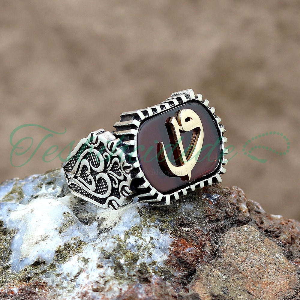 925 Ayar Gümüş Elif Vav Tasarım Akik Taşlı Erkek Yüzük |