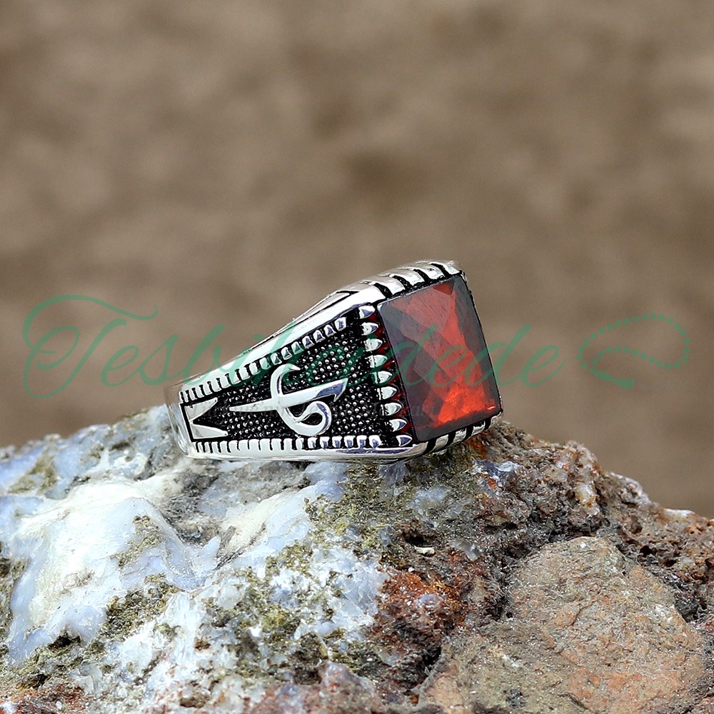 925 Ayar Gümüş Elif Vav Tasarım Kırmızı Zirkon Taşlı Erkek Yüzük |