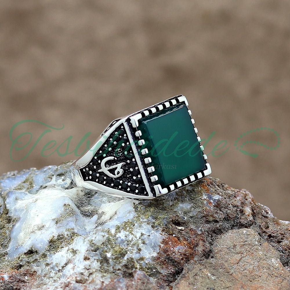 925 Ayar Gümüş Elif Vav Tasarım Yeşil Akik Taşlı Erkek Yüzük |