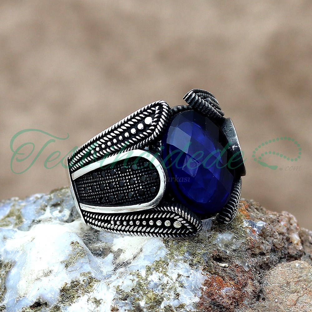 925 Ayar Gümüş Lale Tasarım Mavi Zirkon Taşlı Erkek Yüzük |