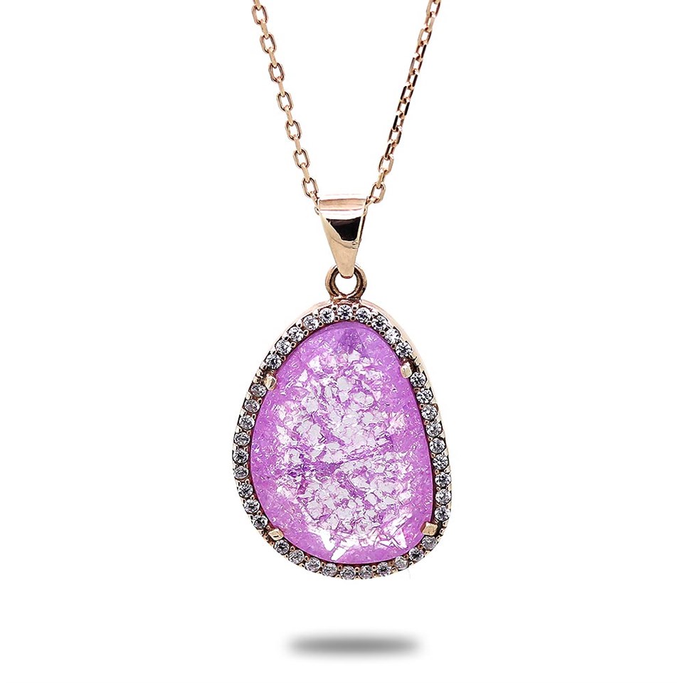 925 Ayar Gümüş Mor Damarlı Cam Taş Kolye |