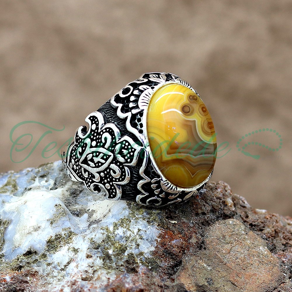 925 Ayar Gümüş Motifli Hint Akik Taşlı Erkek Yüzük |