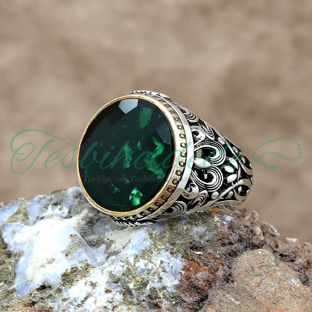 925 Ayar Gümüş Motifli Yeşil Zirkon Taşlı Yüzük |