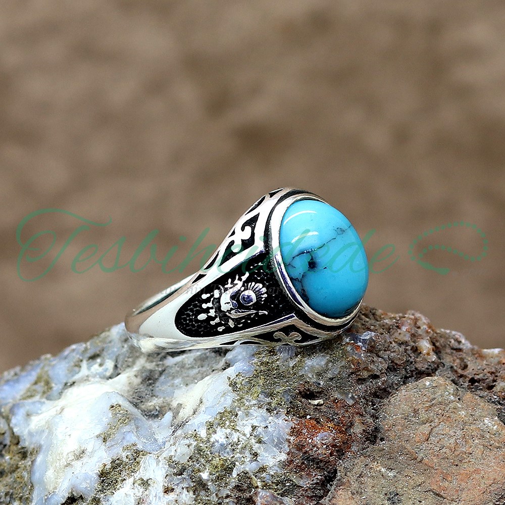 925 Ayar Gümüş Osmanlı Arma Tasarım Firuze(Turkuaz) Taşlı Erkek Yüzük |