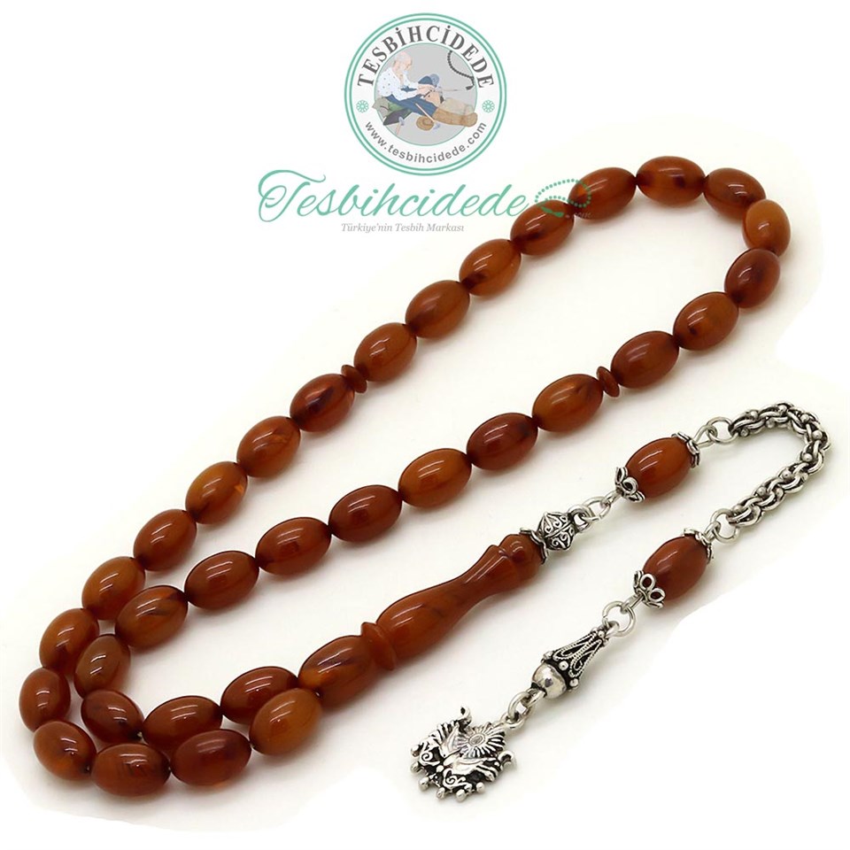 925 Ayar Gümüş Osmanlı Arması Püsküllü Eskitme Hareli Sıkma Kehribar Tesbih |