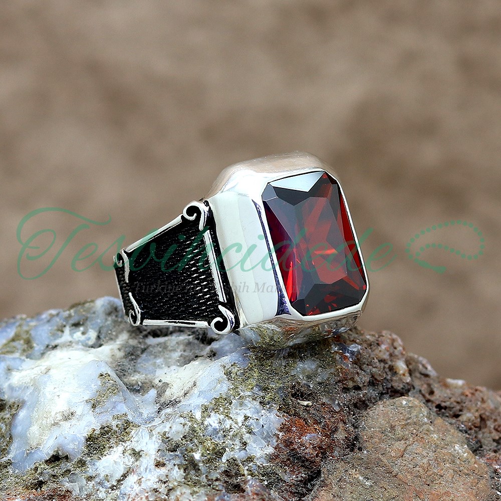 925 Ayar Gümüş Özel Tasarım Kırmızı Zirkon Taşlı Erkek Yüzük |