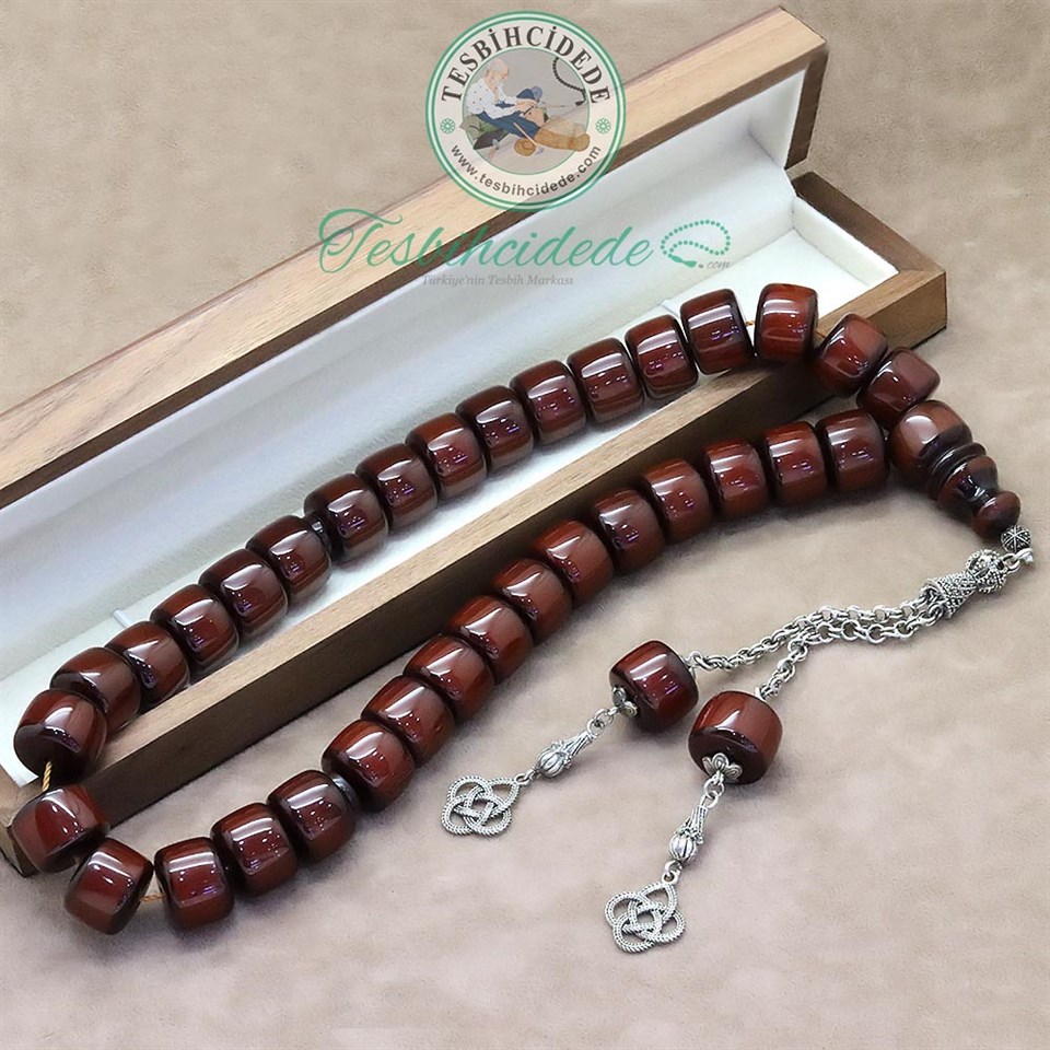 925 Ayar Gümüş Püsküllü Büyük Tekerlek Kesim Sürmeli Sıkma Kehribar Tesbih |