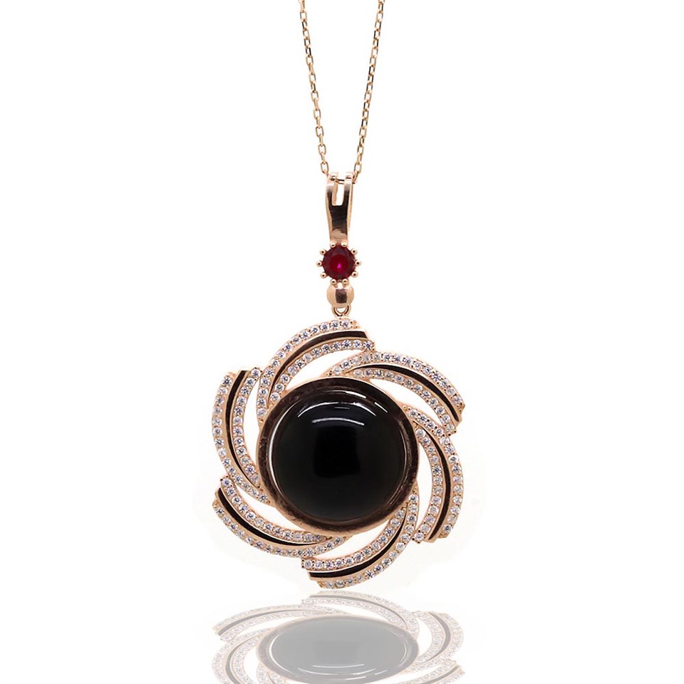925 Ayar Gümüş Roze Rüzgar Gülü Oltu Taşı Kolye |