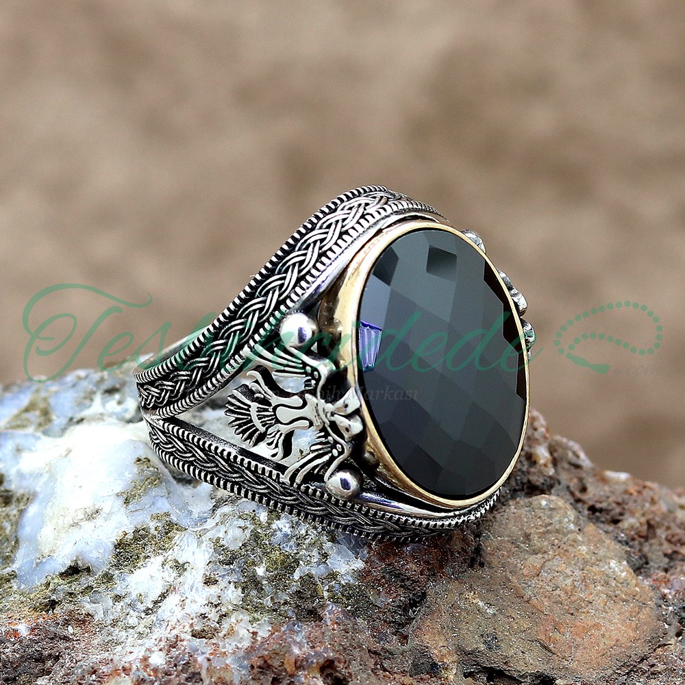 925 Ayar Gümüş Selçuklu Kartalı Siyah Zirkon Taşlı Erkek Yüzük |