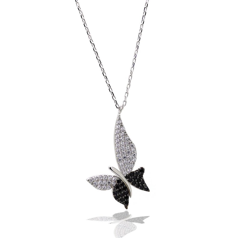 925 Ayar Gümüş Siyah Zirkon Taşlı Kelebek Hayalet Kolye |