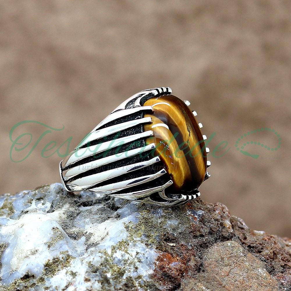925 Ayar Gümüş Tasarım Kaplan Gözü Taşlı Erkek Yüzük |