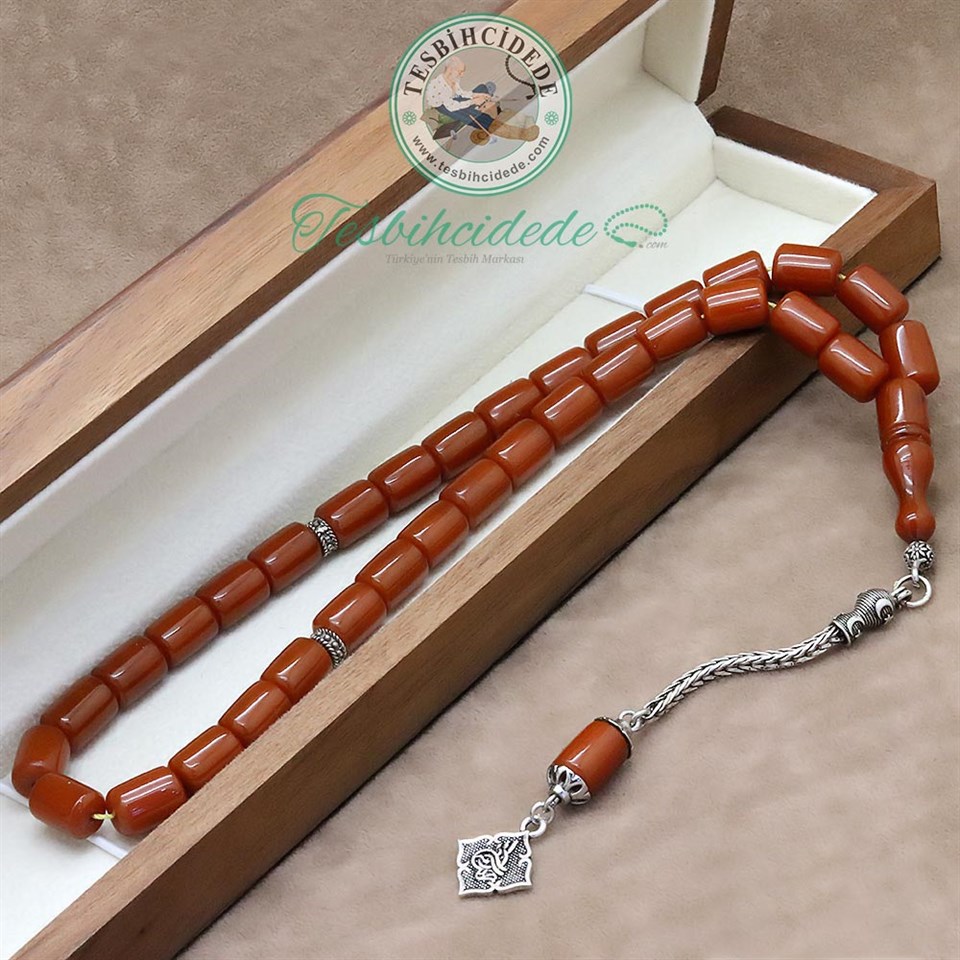 925 Ayar Gümüş Tuğra Püsküllü Eskitme Kesme Sıkma Kehribar Tesbih |