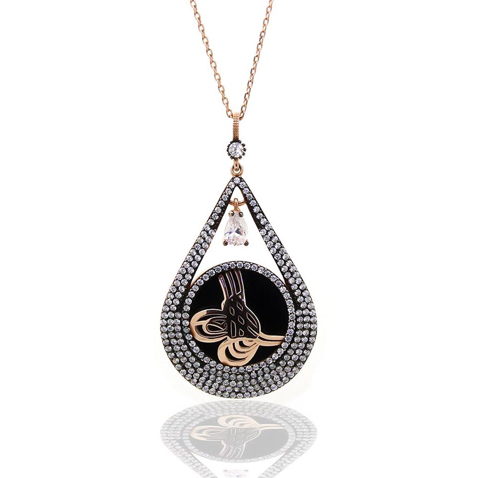 925 Ayar Gümüş Tuğra Roze Damla Model Oltu Taşı Kolye |