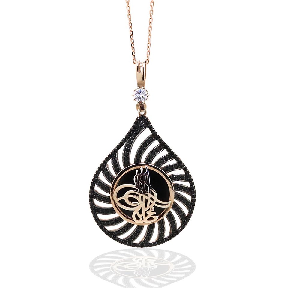 925 Ayar Gümüş Tuğra Roze Model Oltu Taşı Kolye |