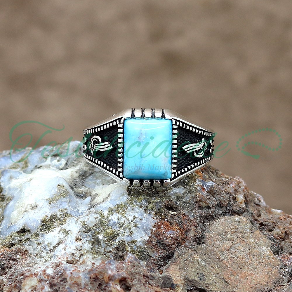 925 Ayar Gümüş Tuğra Tasarım Firuze(Turkuaz) Taşlı Erkek Yüzük |