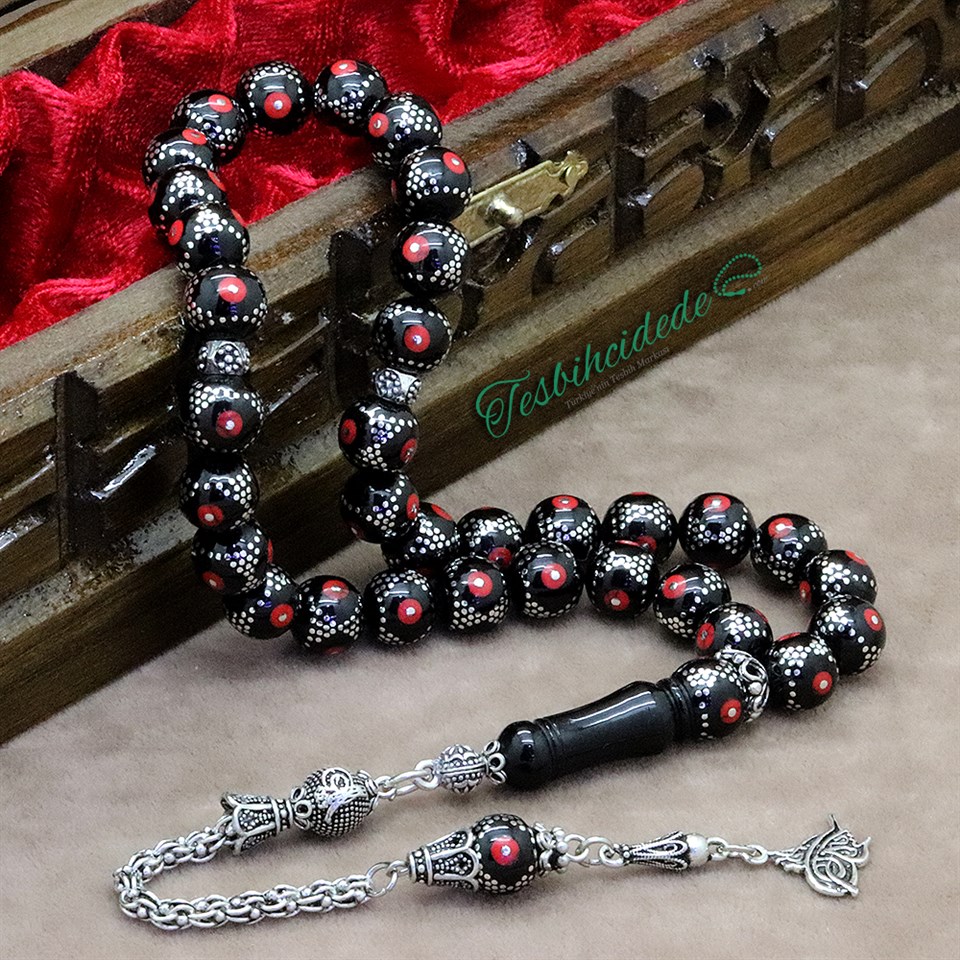 925 Ayar Gümüş Tuğra Tasarım Mercan İşlemeli Erzurum Oltu Taşı Tesbih |