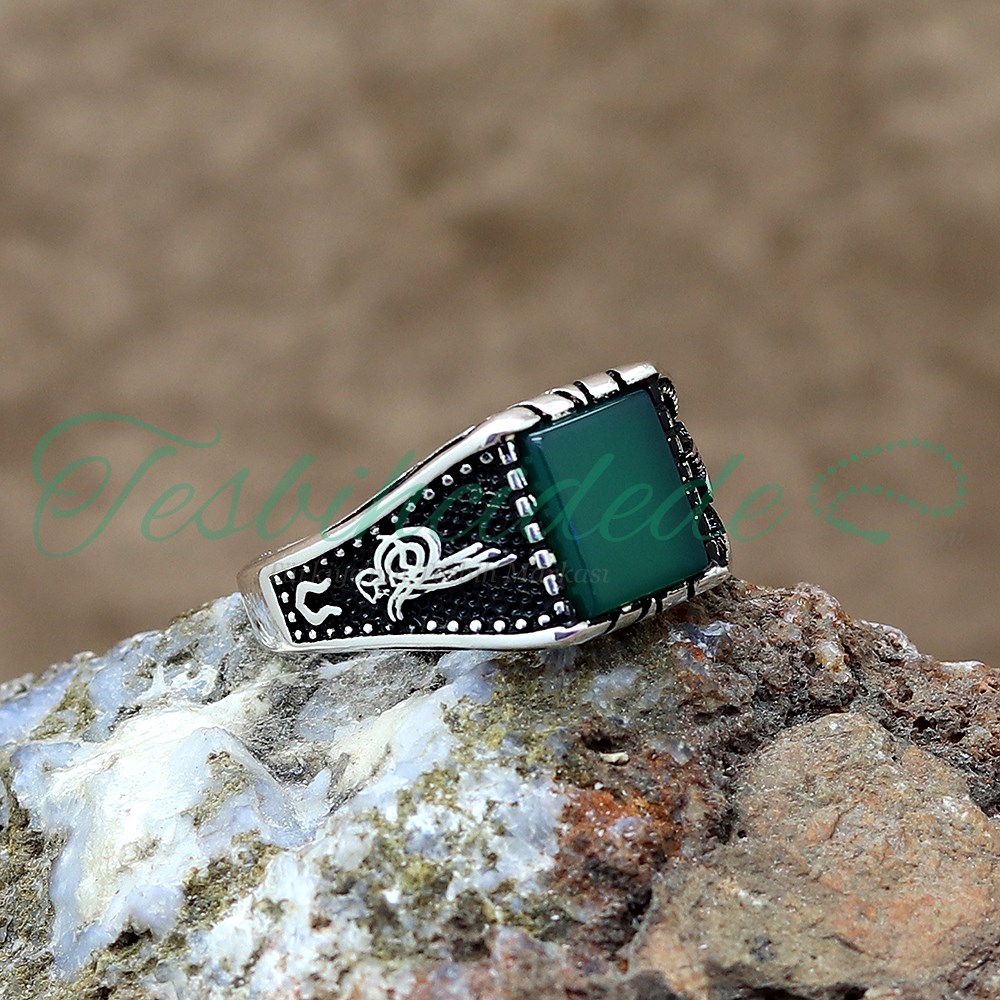 925 Ayar Gümüş Tuğra Tasarım Yeşil Akik Taşlı Erkek Yüzük |