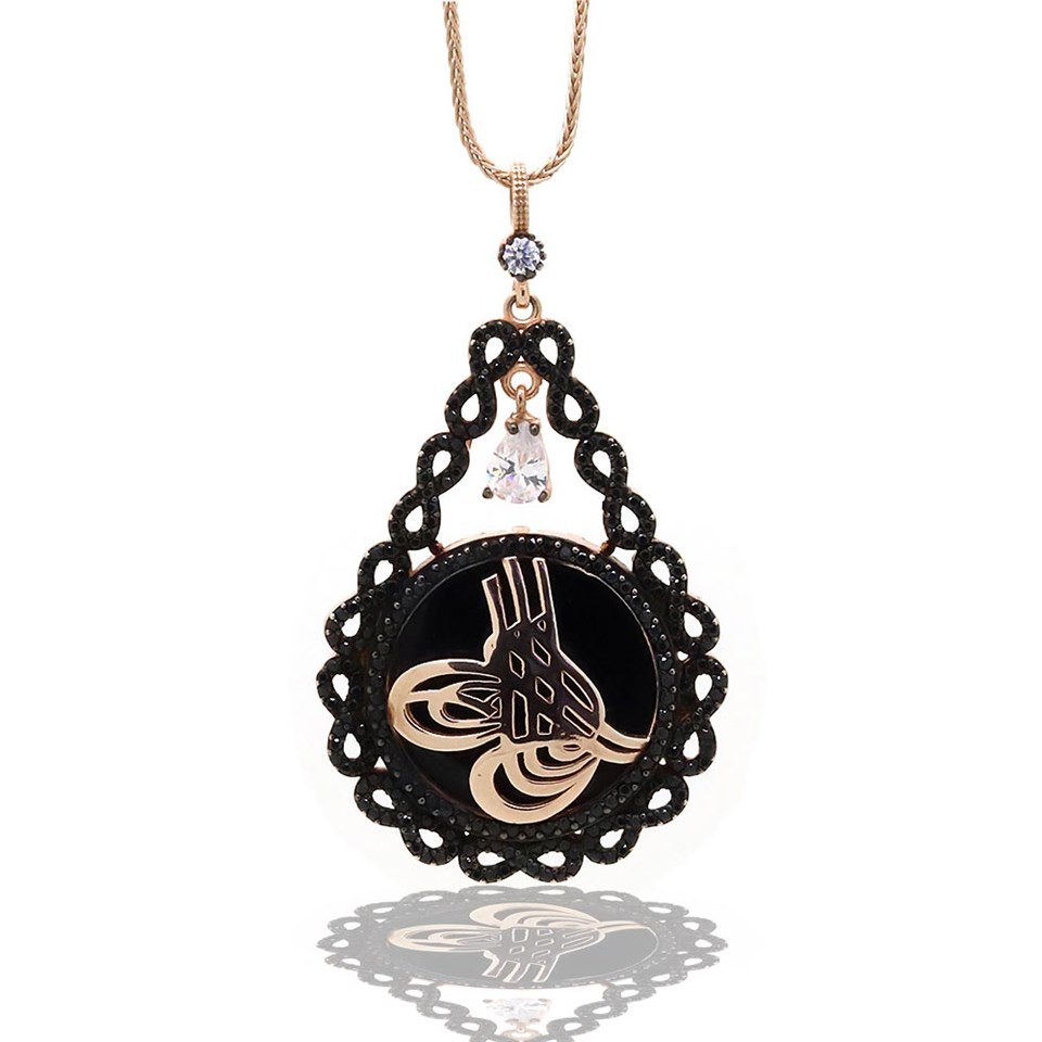 925 Ayar Gümüş Tuğra ve Sonsuzluk Roze Damla Model Oltu Taşı Kolye |