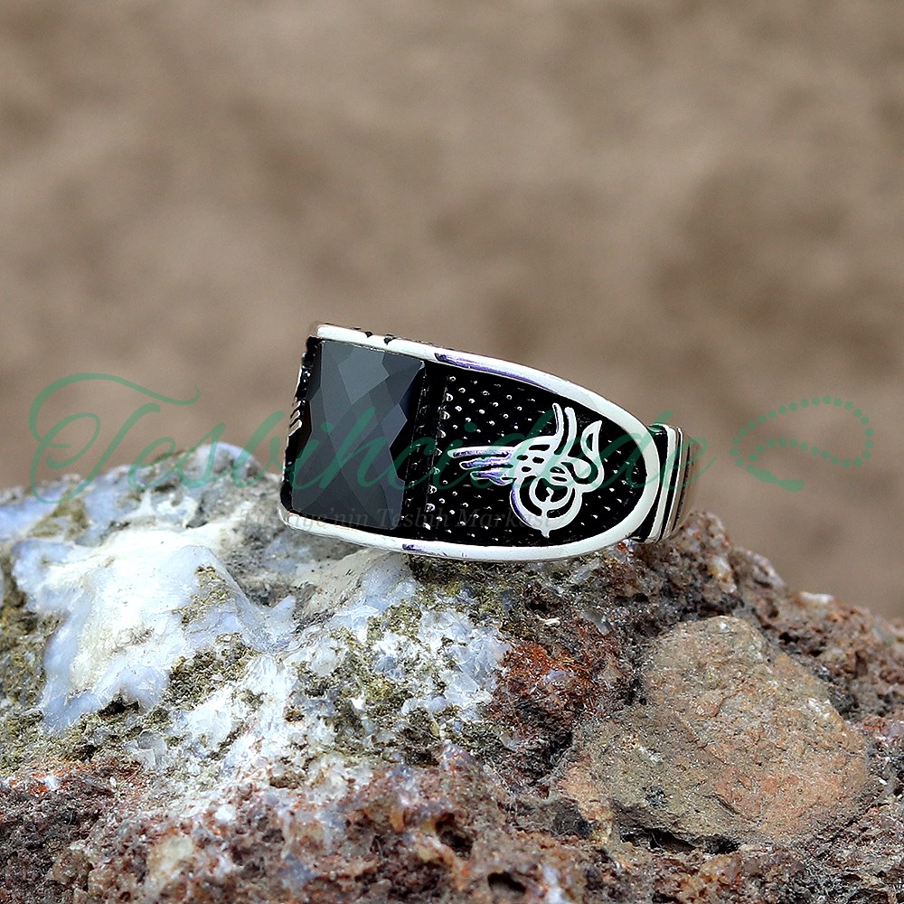 925 Ayar Gümüş Tuğralı Siyah Zirkon Taşlı Erkek Yüzük |