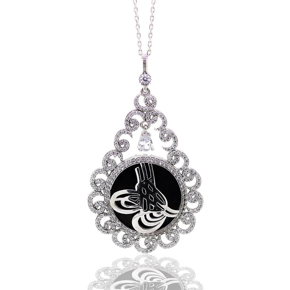925 Ayar Gümüş Vav ve Tuğra Model Oltu Taşı Kolye |