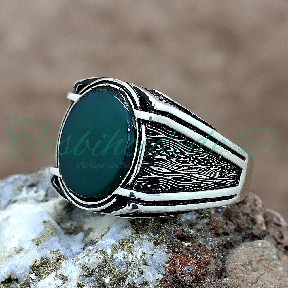 925 Ayar Gümüş Yeşil Akik Taşlı Erkek Yüzük |
