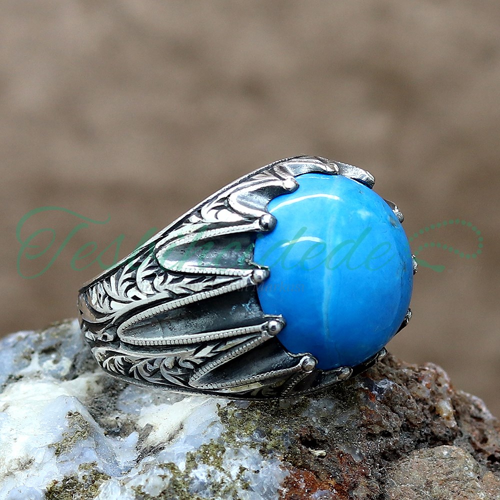 Erzurum El İşi Firuze(Turkuaz) Taşlı Gümüş Erkek Yüzük |