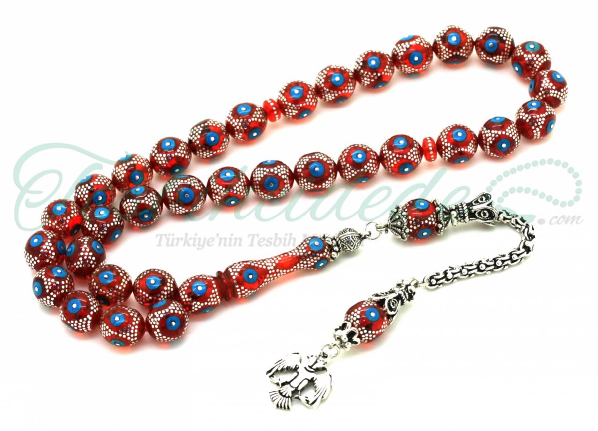 9 mm tane ölçüsü ve kırmızı taneleri şerit gibi yaran gümüş ve Firuze işlemesiyle estetik bir görünüm sağlayan Özel Yapım Firuze ve Gümüş İşlemeli Ateş Kehribar Tesbihi, koleksiyonuna yeni bir tasarım kazandırmak isteyenler için ideal modeller arasında yer alıyor.