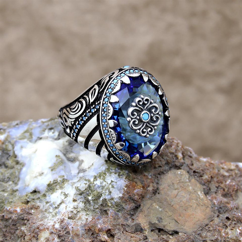 Gök Mavi Zirkon Taşlı Gümüş Erkek Yüzük |