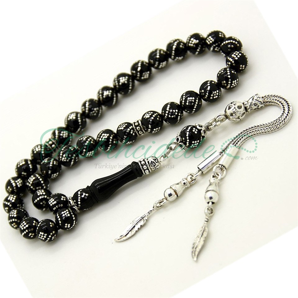 Gümüş Çeşm-i Bülbül ve Baklava İşlemeli Erzurum Oltu Taşı Tesbih |