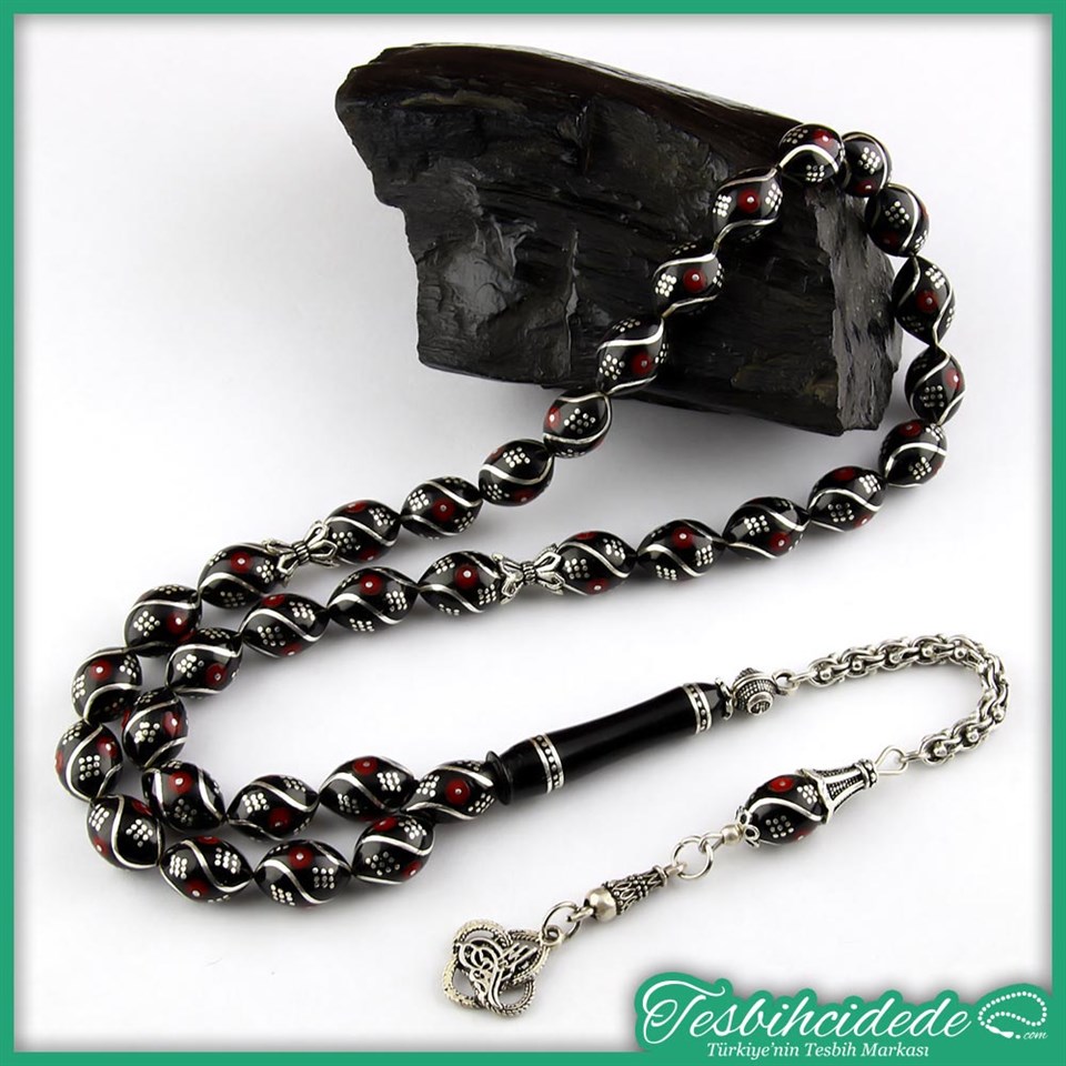 | Ürün Adı | Gümüş Çeşm-i Bülbül ve Kırmızı Mine İşlemeli Erzurum Oltu Taşı Tesbih |