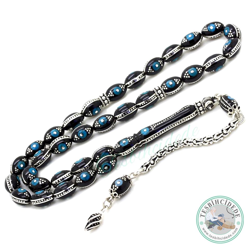 Gümüş Yarma ve Firuze İşlemeli Erzurum Oltu Taşı Tesbih |