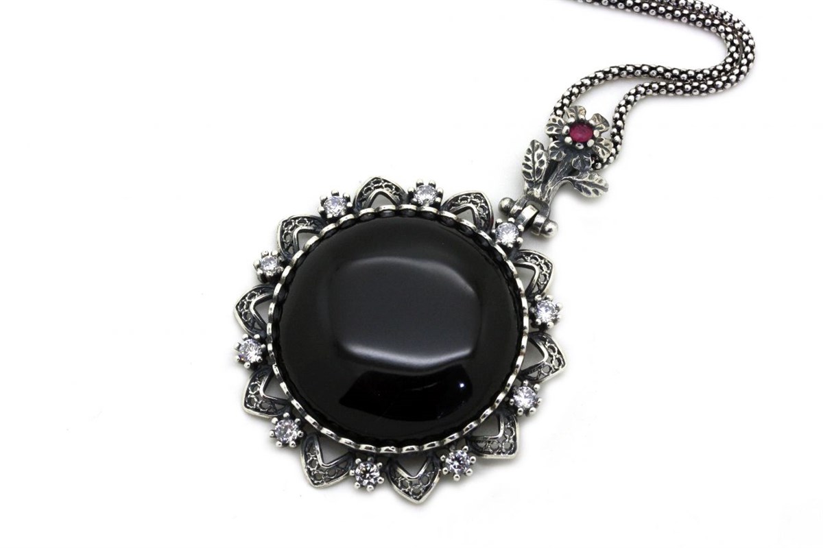 Tesbihci Dede atölyelerinde birinci sınıf işçilik ve oltu taşından imal edilen kolye, gümüş zincir ile süslenerek daha parlak ve dikkat çekici bir hale getirildi.