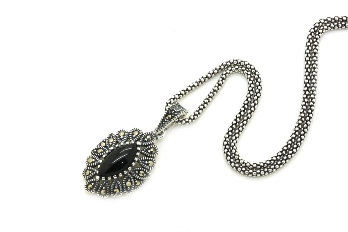 Tesbihci Dede atölyelerinde birinci sınıf işçilik ve oltu taşından imal edilen kolye, gümüş zincir ile süslenerek daha parlak ve dikkat çekici bir hale getirildi.