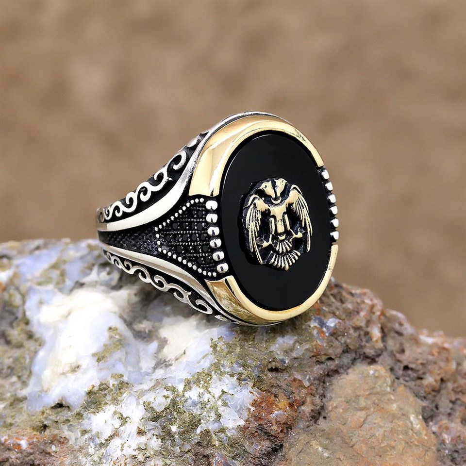 | Ürün Adı | Oniks Taşlı Çift Başlı Kartal Motifli Gümüş Erkek Yüzük |
