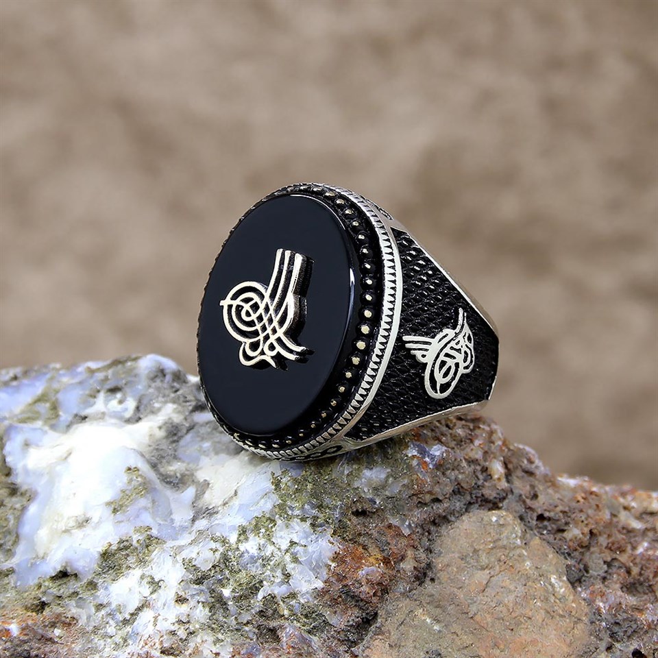 Osmanlı Tuğralı Siyah Oniks Taşlı Gümüş Erkek Yüzük |