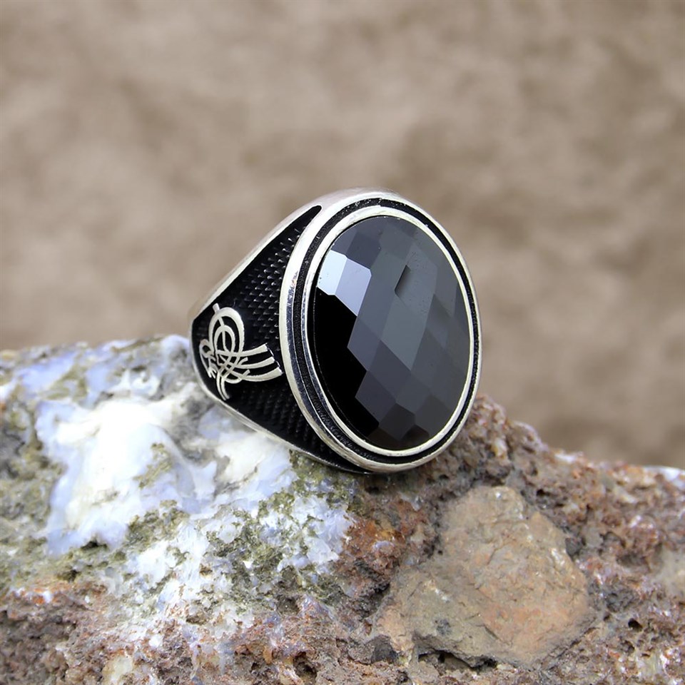 Siyah Zirkon Taşlı Tuğra Motifli Gümüş Erkek Yüzük |