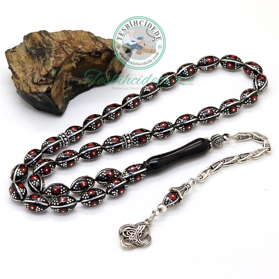 | Ürün Adı | Tuğra Gümüş Püsküllü Bordo Mine ve Karpuz İşlemeli Erzurum Oltu Taşı Tesbih |
