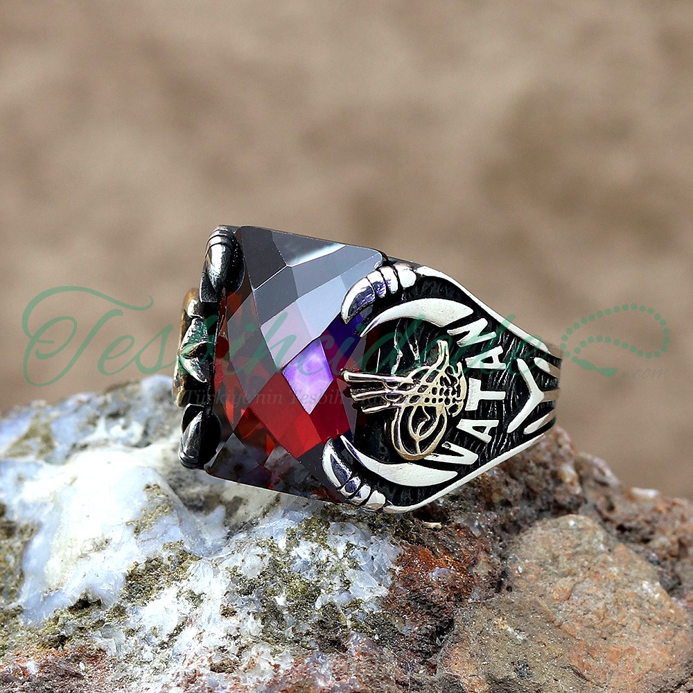 Türk ve Vatan Yazılı Tuğra Ayyıldız Tasarım Pençeli Zirkon Taşlı Erkek Yüzük |