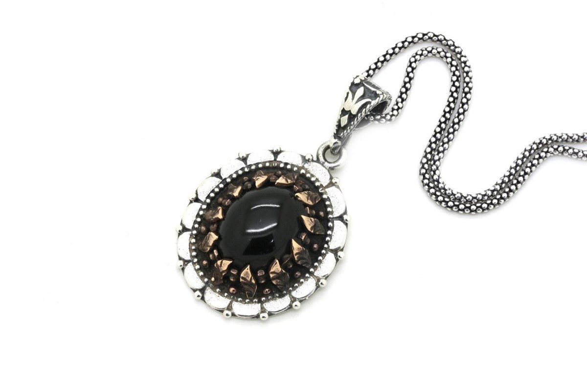 Özel el işçiliğiyle estetik bir görünüm sağlayan Hakiki Oltu Taşından üretilen bu kolye modeli, koleksiyonuna yeni bir tasarım kazandırmak isteyenler için ideal modeller arasında yer alıyor.