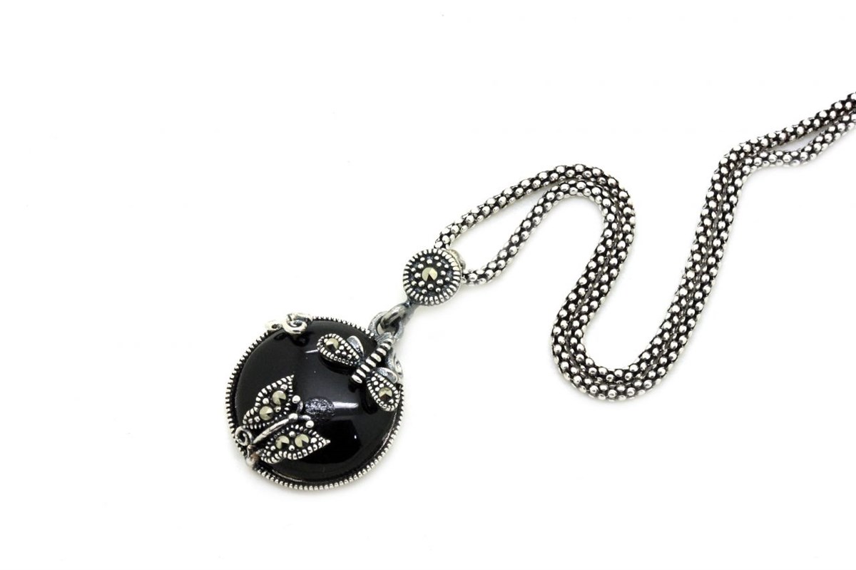 Tesbihci Dede atölyelerinde birinci sınıf işçilik ve oltu taşından imal edilen kolye, gümüş zincir ile süslenerek daha parlak ve dikkat çekici bir hale getirildi.
