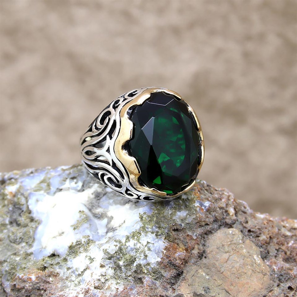 Zümrüt Yeşili Zirkon Taşlı Gümüş Erkek Yüzük |